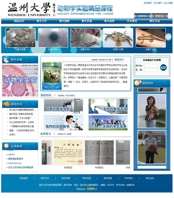 我公司為溫州大學(xué)生命與環(huán)境科學(xué)學(xué)院,建立的動(dòng)物學(xué)實(shí)驗(yàn)精品課程網(wǎng) 經(jīng)浙江省教育廳評(píng)審,被評(píng)為浙江省高等學(xué)校省級(jí)精品課程網(wǎng)站。這也是我公司開創(chuàng)了第一個(gè)省級(jí)精品課程網(wǎng)。同時(shí)也慶祝公司在精品課程網(wǎng)站制作方面更上一個(gè)新的臺(tái)階,同時(shí)希望以后能夠?yàn)楦叩仍盒7?wù),創(chuàng)立更好的網(wǎng)站。